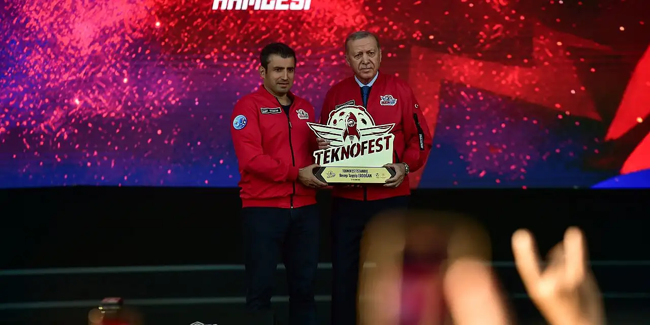 Konuşmasının ardından TEKNOFEST yarışmalarında dereceye giren öğrencilere ödüllerini takdim eden Cumhurbaşkanı, alandaki coşkulu kalabalık tarafından Türk bayrakları ve TEKNOFEST flamalarıyla karşılandı.