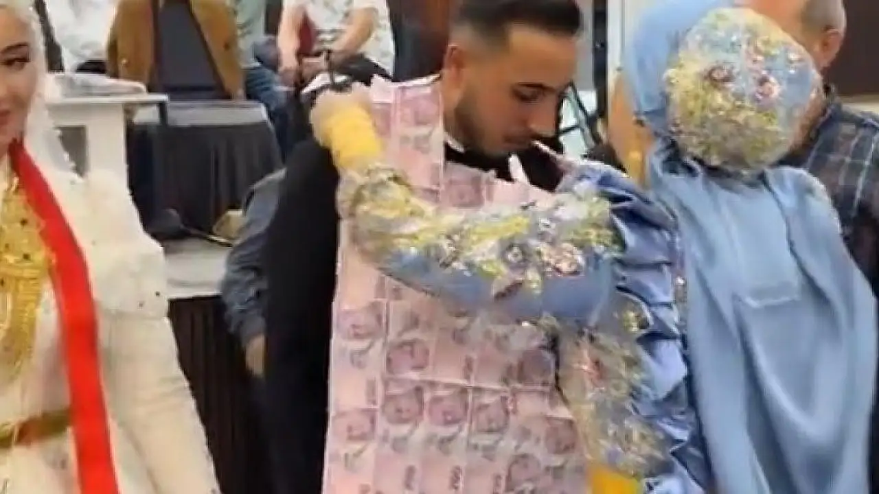 Kızıltepe ilçesinde yapılan bir düğünün takı töreninde damada valiz içerisinde getirilen 200 TL'lik banknotlardan oluşan yelek giydirildi. Atkı şeklinde hazırlanan diğer 200 TL'lik banknotlar da hem damada hem de geline takıldı. Gelin ve damadın üzeri banknotlarla kaplanırken o anlar cep telefonuyla görüntülendi. Sosyal medya platformlarında paylaşılan görüntüler ilgi gördü.