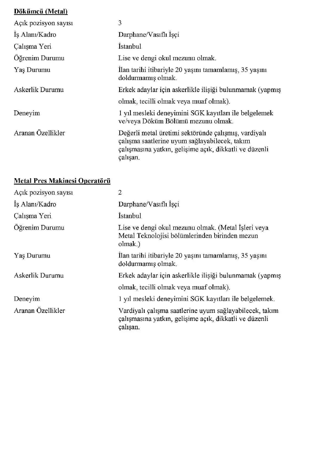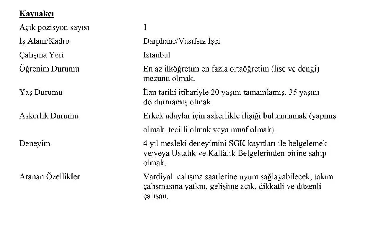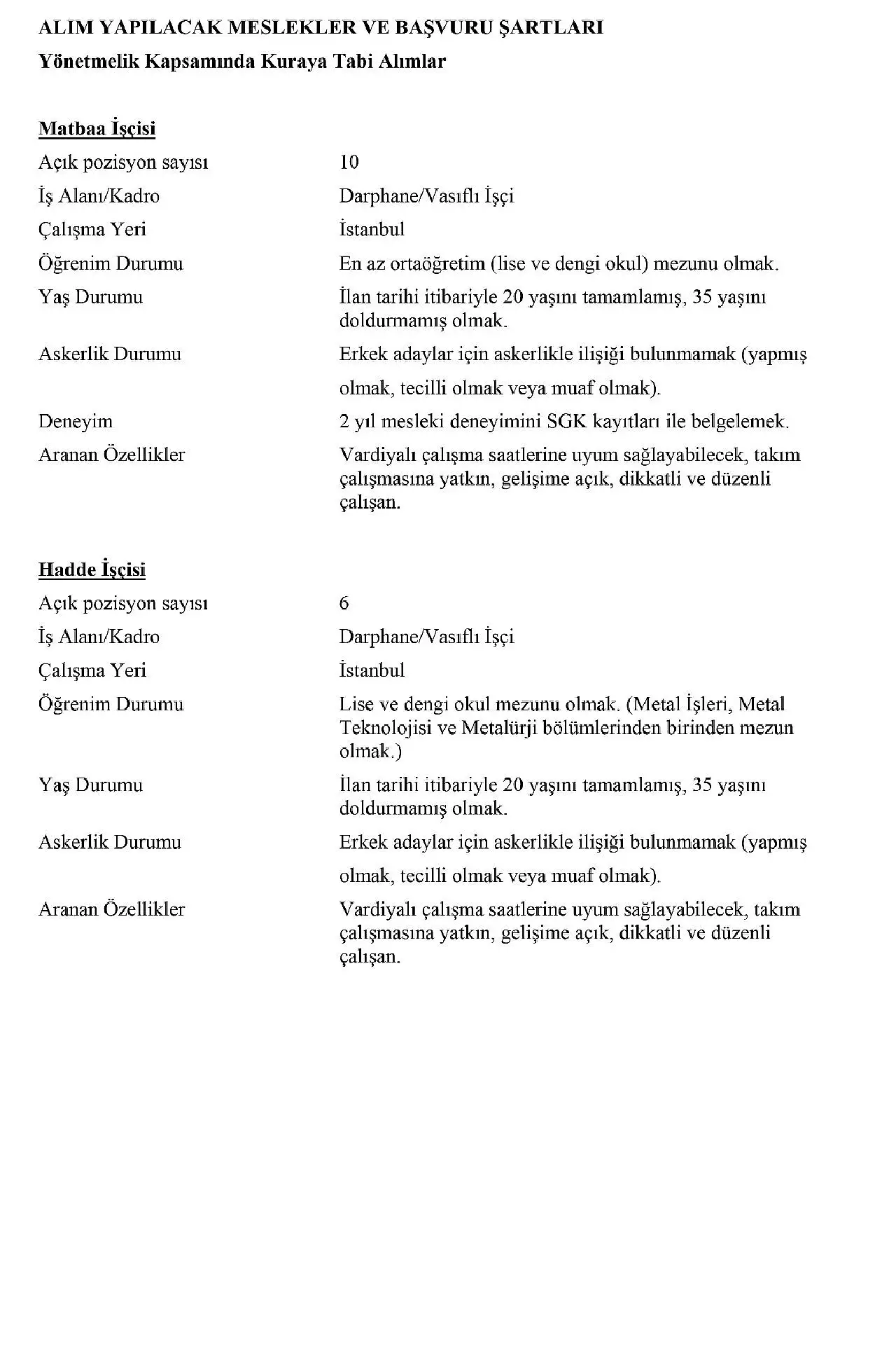 I. Darphane ve Damga Matbaası Genel Müdürlüğümün İstanbul'da, Dikilitaş Mahallesi Yenidoğan Sokak No:55 Beşiktaş ve Orhantepe Mah. Tekel Cad. No:6 Cevizli Kartal adreslerinde bulunan işyerlerinde istihdam edilmek üzere 4857 sayılı İş Kanunu ile bu Kanuna dayanılarak çıkarılan Kamu Kurum ve Kuruluşlarına İşçi alınmasında Uygulanacak Usul ve Esaslar Hakkında Yönetmelik hükümleri çerçevesinde 7 meslek için 25 kamu işçisi alımı yapılacak.