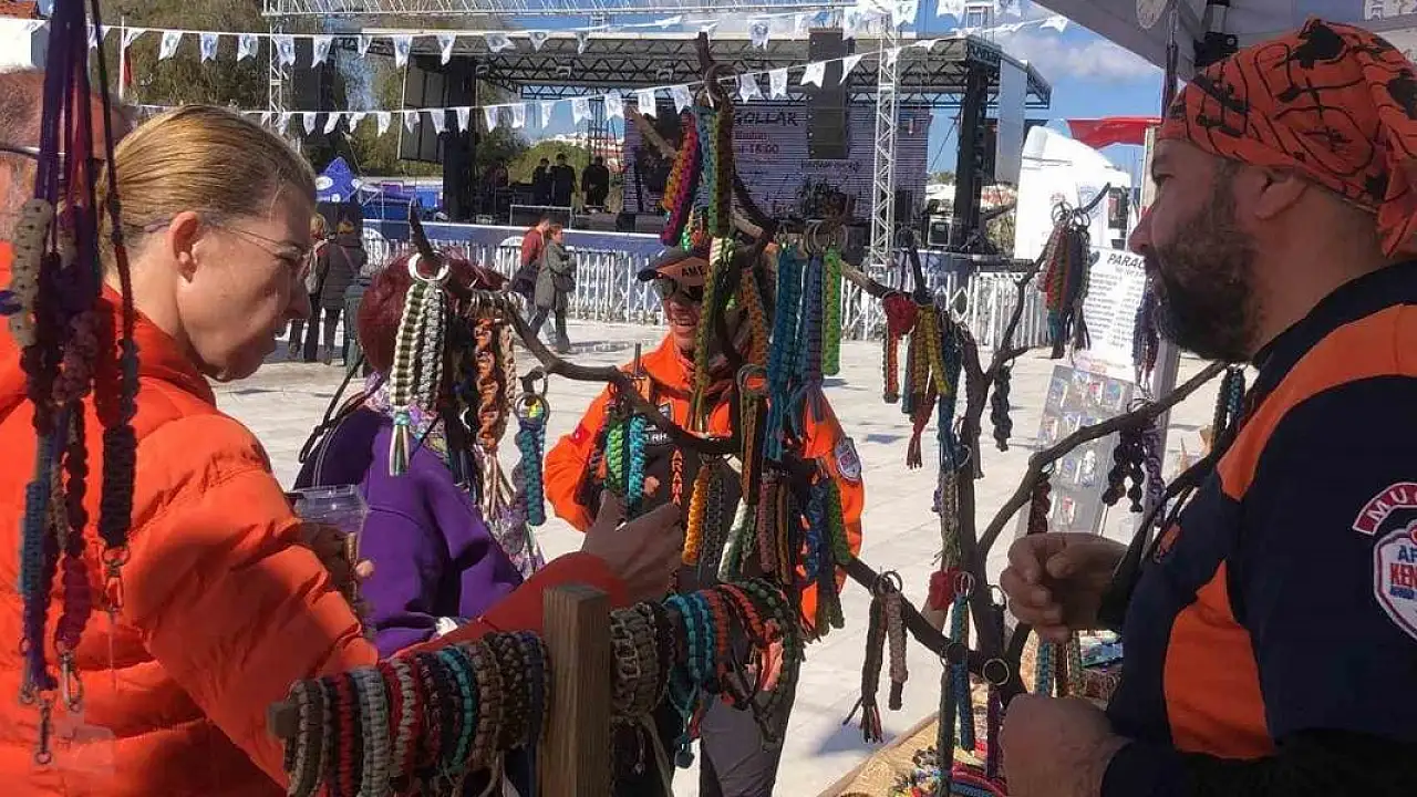 Muğla'nın Datça ilçesinde gerçekleştirilen Geleneksel Datça Badem Çiçeği Festivali, yoğun bir katılımla devam ederken, acil durumlarda kullanılan ve 3 metre ipe dönüşebilen paracord (paraşüt ipi) bileklikler, festivalin alanının ilgi odağı oldu.