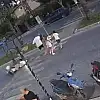 Turistlere çarpmamak için ani fren yapan sürücü, motosikletin hakimiyetini kaybetti. Devrilerek kayan motosiklet, yaya geçidindeki turistlere çarptı.