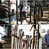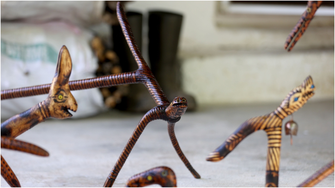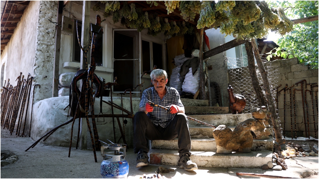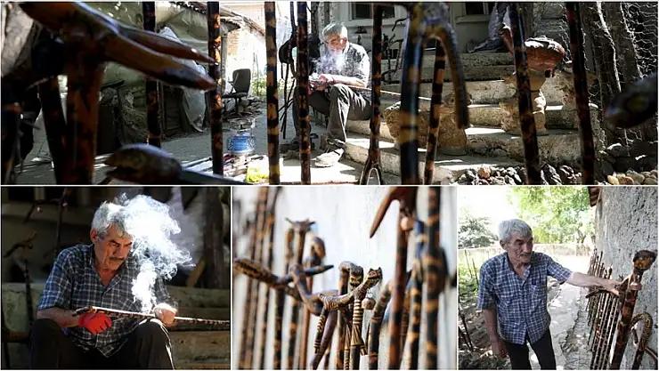 Testere ve ısıttığı demir çubuklarla doğadan topladığı ağaç dallarına şekil vermeye başlayan Olt, işlediği ahşaplardan yaptığı bine yakın bastonu evinin bahçesinde sergiliyor.