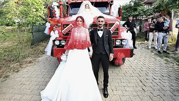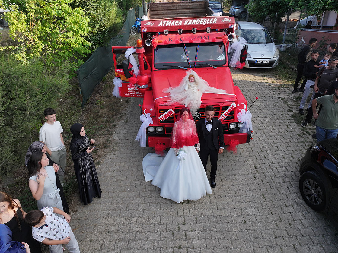 Karaçalı Mahallesi'nde yaşayan 26 yaşındaki Kazancı, hayatını birleştirdiği 23 yaşındaki Nermin Kazancı'nın Çele Mahallesi'ndeki babaevine hafriyat işi yaptığı kamyonunu süsleyerek gitti.Kız alma merasimi için evin önüne gelen damat Kazancı, 'Evleniyoruz,