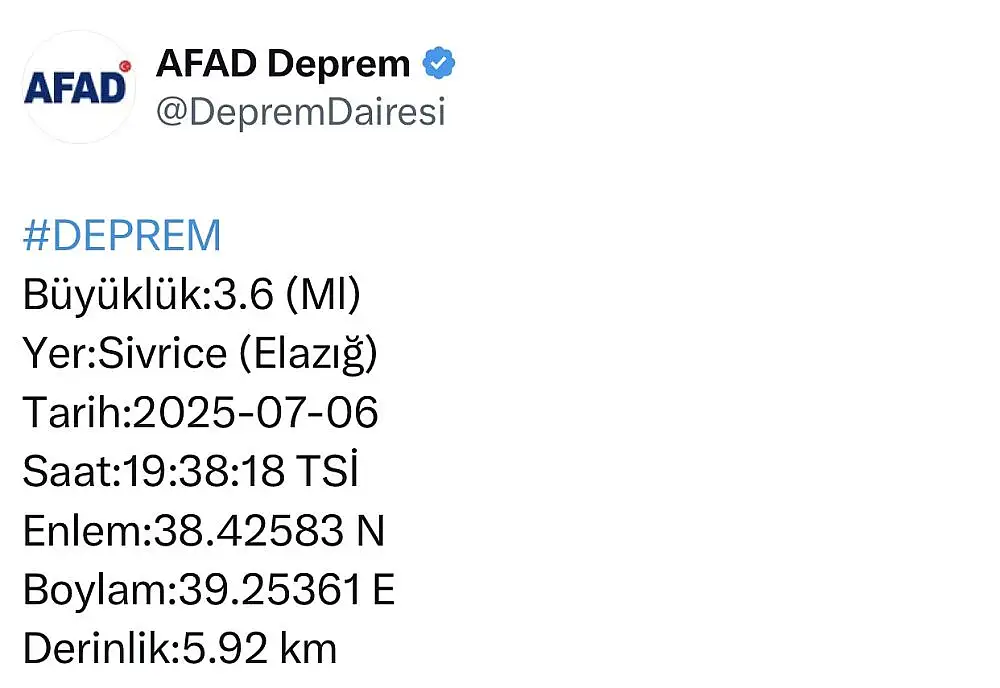 Afet ve Acil Durum Yönetimi Başkanlığı Deprem Dairesi Başkanlığından alınan bilgiye göre, saat 19:38'de merkez üssü Elazığ'ın Sivrice ilçesinde 3.6 büyüklüğünde deprem meydana geldi. Yerin yaklaşık 6 kilometre derinliğinde meydana gelen depremle ilgili olumsuz bir durum yaşanmadığı öğrenildi.