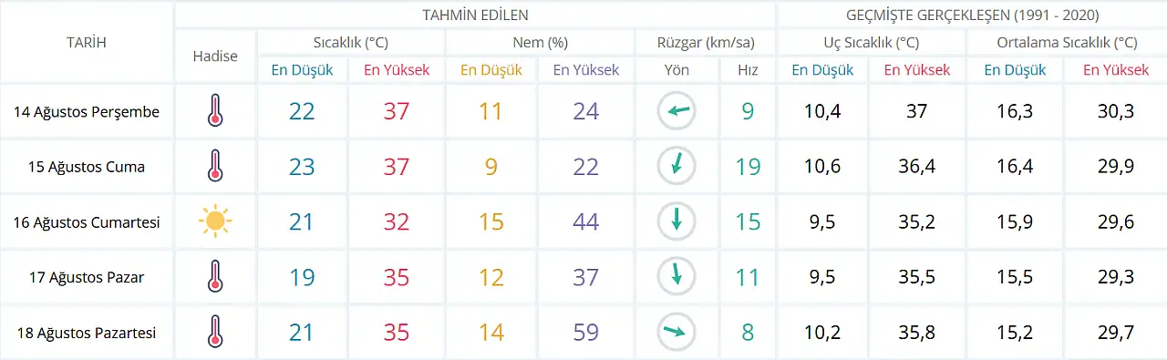 Meteoroloji Genel Müdürlüğü tarafından yapılan son değerlendirmelere göre: Konya ve ilçelerinde Perşembe gününden itibaren sıcaklığın birden artması bekleniyor. 14 Ağustos Perşembe gününden itibaren ise hissedilen sıcaklıklar Konya ve ilçelerinde 37 dereceyi bulacak.