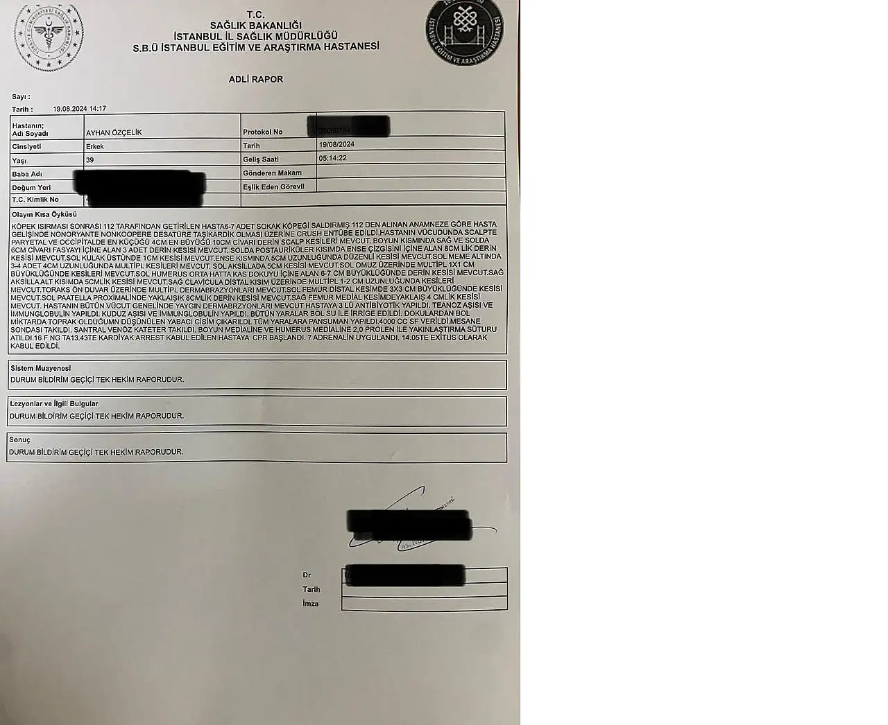 Özçelik'in yaralı olarak götürüldüğü İstanbul Eğitim ve Araştırma Hastanesi'nde hazırlanan adli raporda, köpek ısırması sonrası sağlık ekiplerince hastaneye getirildiği ve kendisine 6-7 sokak köpeğinin saldırdığı belirtildi.Raporda, Özçelik'in entübe edil