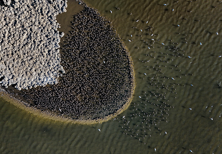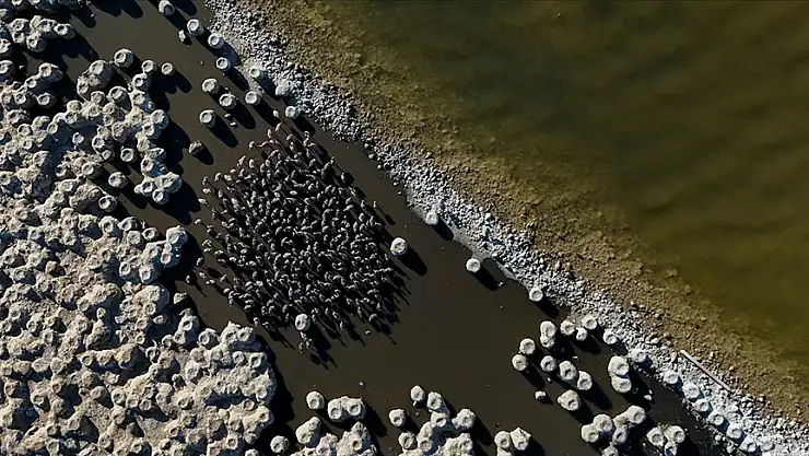 Dünyanın en büyükleri arasında gösterilen yapay adada bu yıl yaklaşık 13 bin yavru, yumurtalarının kabuklarını kırarak hayata "merhaba" dedi. Kuluçka sürecinde yavrularına dönüşümlü olarak bakan flamingo çiftleri, yavrularını beslemek için yine birlikte mücadele veriyor.