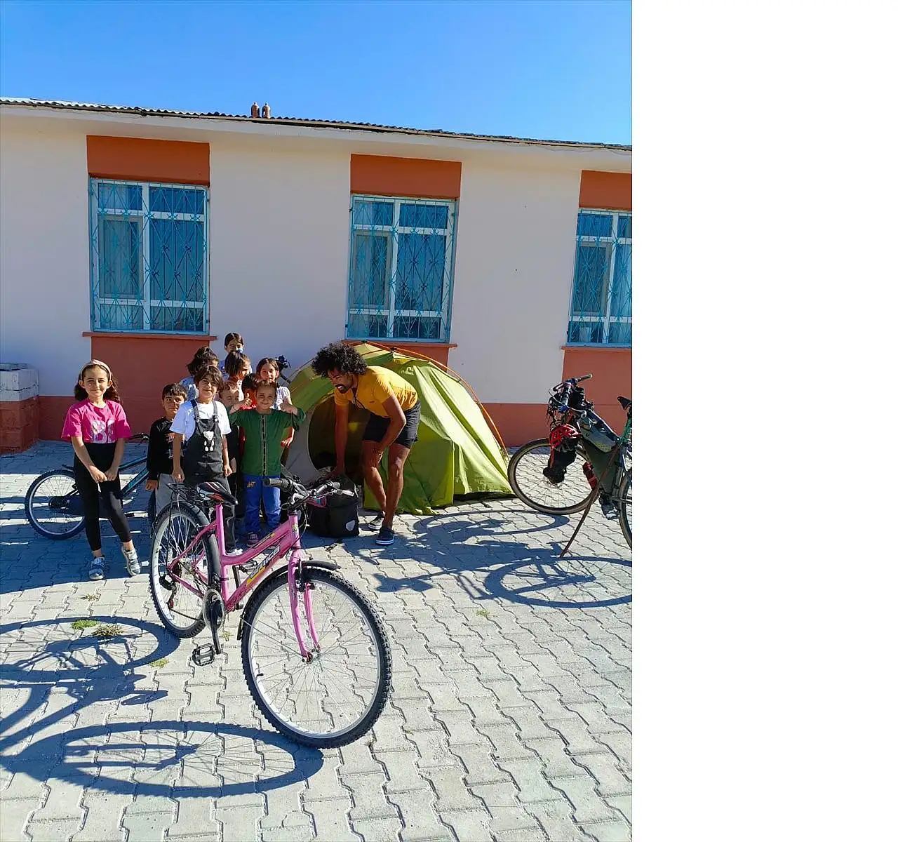 İlçeye bağlı Tilkili Mahallesi'ndeki okul bahçesinde kurulmuş bir kamp çadırı gören öğrenciler, şaşkınlıkla durumu öğretmenlerine bildirdi.Öğretmen Muzaffer Gündüz, Fransa'dan Kazakistan'a bisikletle seyahat eden Fransız Lion ve Olivia ile öğrencileri tan