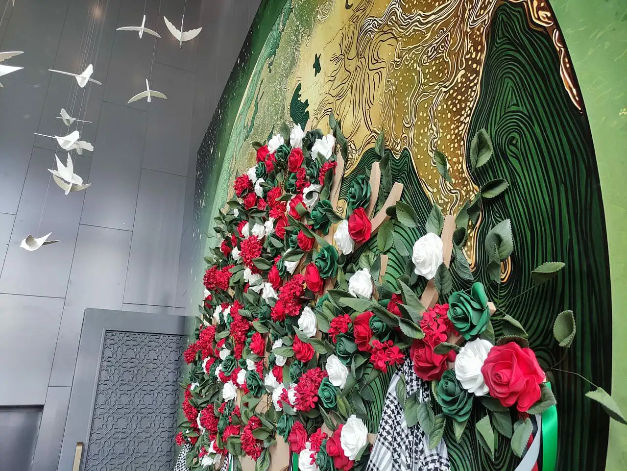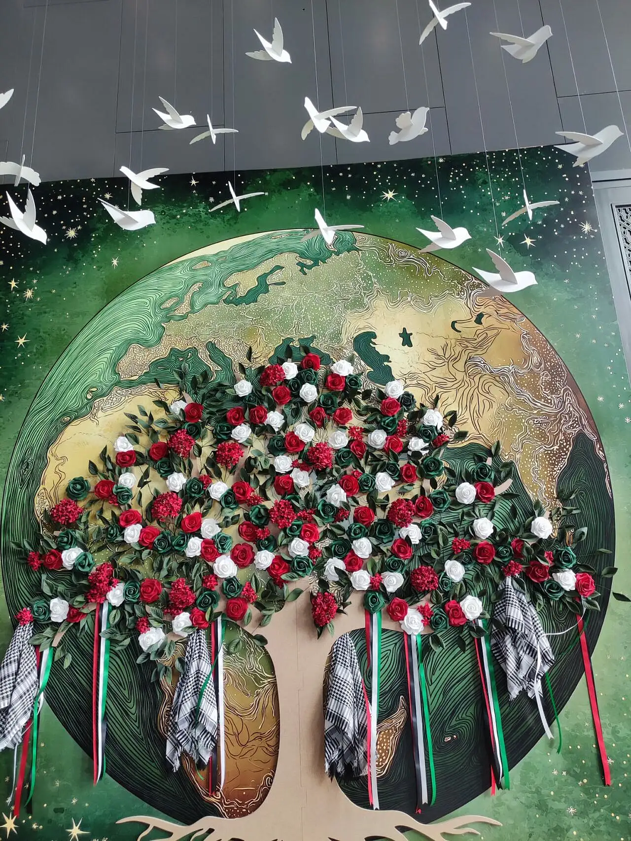 Konya Büyükşehir Belediyesi tarafından bu yıl 12'ncisi düzenlenen Konya Kitap Günleri, sadece kitap ve yazar buluşmalarıyla değil, aynı zamanda anlamlı bir sanat çalışmasıyla da dikkat çekiyor.Etkinliğin girişinde yer alan ve Filistin bayrağının renkleri