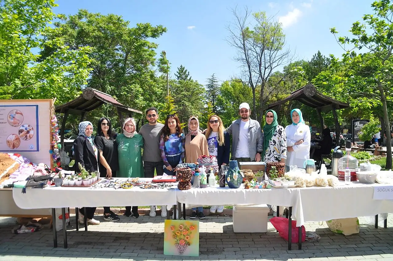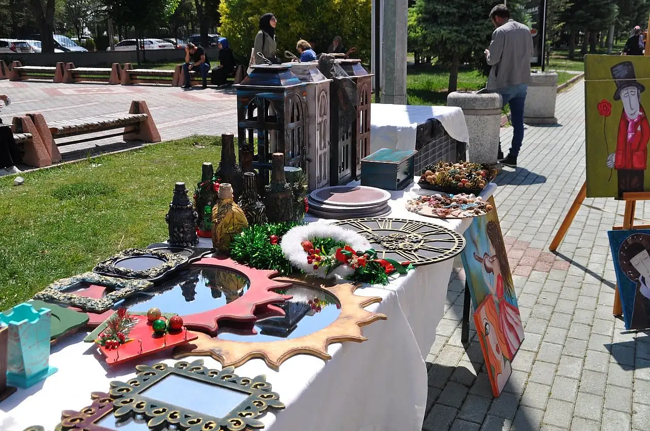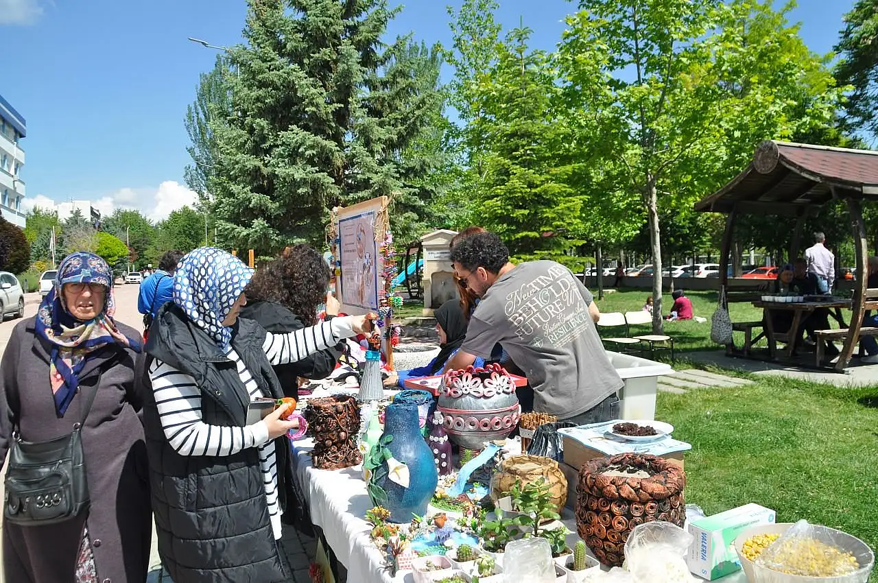 Ürünlerin çoğunu hastaların toplayıp, boyadıklarını söyleyen Selçuklu Halk Eğitim Merkezi bünyesinde Selçuk Üniversitesi Tıp Fakültesi Hastanesi TRSM bölümünde el sanatları öğretmenliği yapan Yıldız Aşcı “Burada öğrencilerimizle bahçeden kozalak, taş toplayıp onları boyuyoruz. Geri dönüşüme katkı sağlamak amacıyla kullanılmış çöpe gidecek materyalleri boyayıp, süslüyoruz. Balon, pet şişesi, artık kumaşlardan örtüler ve pofidik yorganlar yaparak hastalarımızın keyifli vakit geçirmesini sağlamaya çalışıyoruz. Sergimizde de yaptığımız ürünlerin hem tanıtımı hem de satışını yapıyoruz” şeklinde konuştu.