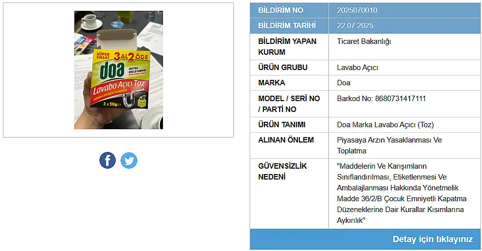 Ticaret Bakanlığı, Güvensiz Ürün Bilgi Sistemi’nde sağlığa zararlı ürünler listesini güncelledi. Yapılan denetimlerde güvensiz olarak nitelendirilen ürünlere 22 Temmuz tarihinden itibaren 4 ürün eklendi.