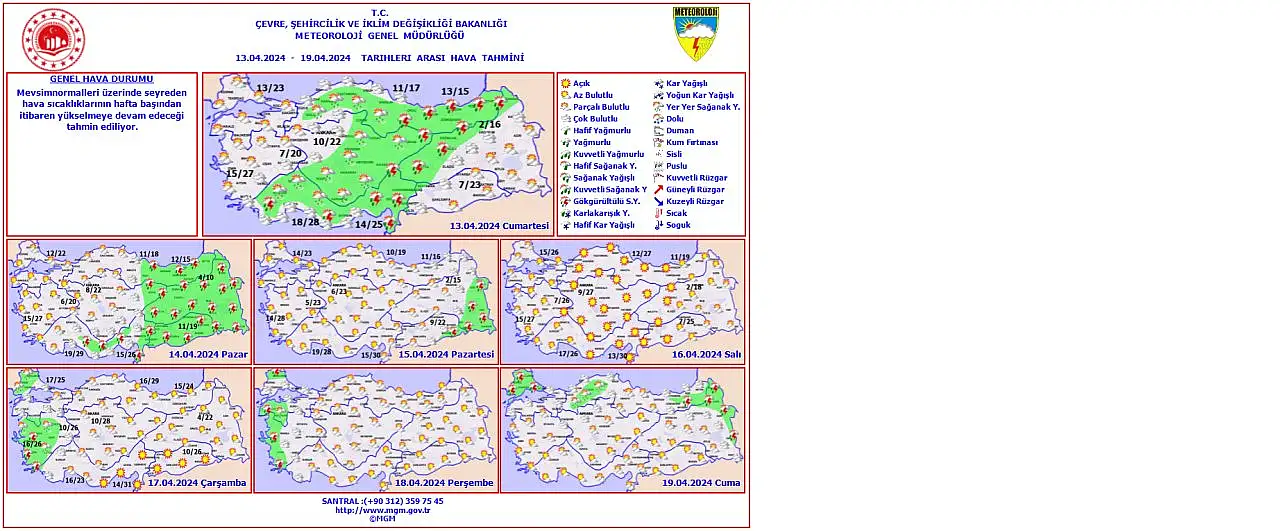 Meteoroloji Genel Müdürlüğü tarafından yapılan son tahminlere göre bugün yurdun kuzey ve iç kesimlerinin parçalı yer yer çok bulutlu, Batı ve Orta Akdeniz'in iç kesimleri, Doğu Akdeniz, İç Anadolu'nun güneyi ve doğusu, Batı ve Orta Karadeniz'in iç kesimle