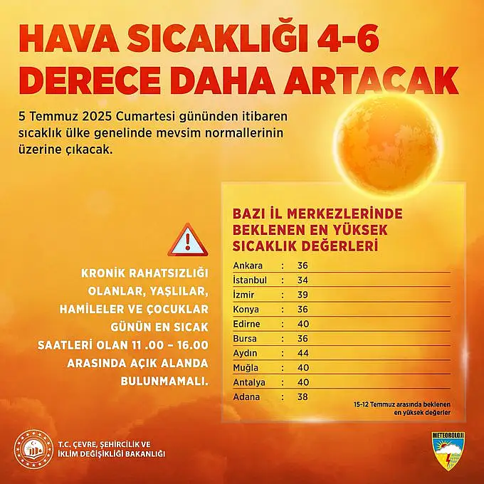 Çevre, Şehircilik ve İklim Değişikliği Bakanlığı Meteoroloji Genel Müdürlüğü’nün değerlendirmelerine göre iç ve doğu kesimlerde mevsim normalleri altında seyreden hava sıcaklıkları ülke genelinde artacak. 5-12 Temmuz arasında sıcaklıkların 4-6 derece daha artması bekleniyor.