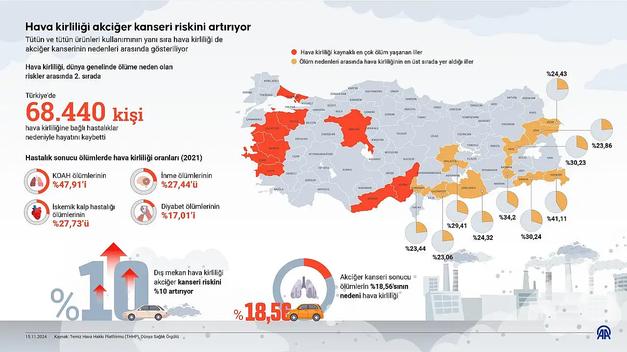 Hava kalitesi ile ilgili olarak Temiz Hava Hakkı Platformu (THHP) tarafından her yıl yayımlanan Kara Rapor'a göre Türkiye'de 2022 yılında 68 bin 440 kişi hava kirliliğine bağlı hastalıklar nedeniyle hayatını kaybederken hava kirliliğiyle ilişkili ilk 5 ölüm nedeni kalp-damar hastalıkları, kronik solunum hastalıkları, kanserler, diyabet ve kronik böbrek hastalıkları ile solunum enfeksiyonları olarak sıralandı.