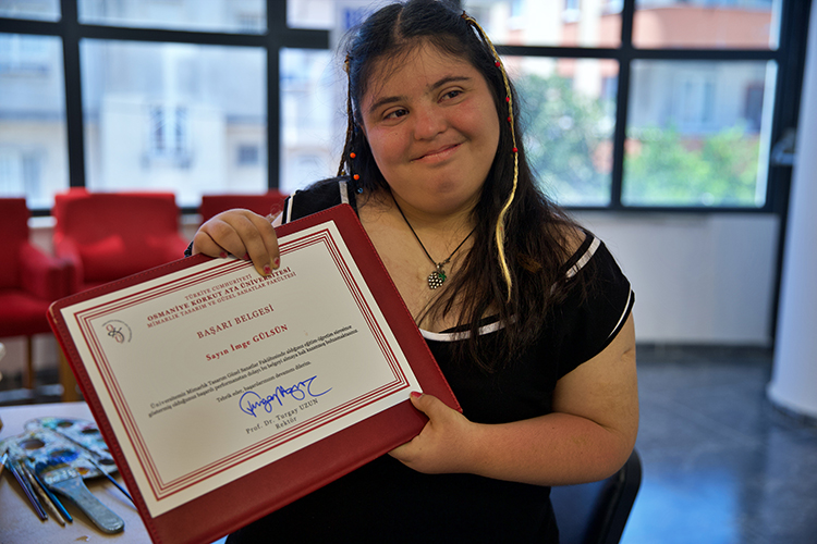 Üniversite eğitimini başarıyla tamamlayıp diplomasını alan Gülsün, kendisi gibi özel gereksinimli bireylere resim yapmayı öğretmeyi hedefliyor.