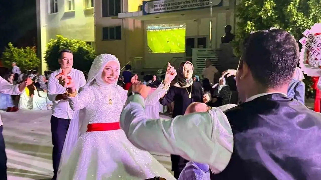 Ülke genelinde olduğu gibi Fethiye'de de Türkiye ile Hollanda arasındaki EURO 2024 maçı heyecanı yaşanırken, hayatlarını birleştiren Eda Gencel ve Mehmet Ali Kaya çifti de kendileri ve davetlileri bu heyecandan geri bırakmadılar. Bir okulun bahçesinde düzenlenen düğün alanına dev ekran kurduran çiftler, hem oynadılar, hem de dev ekranda maçı takip ettiler. Takı töreni arasında milli takım için yazılmış marşlar ve şarkılar çalındığı düğünde, damat Mehmet Ali Kaya, ekrandan gözünü uzun süre alamayınca çevresindekiler tarafından uyarıldı. Hem eğlence hem de milli maçın heyecanını doyasıya yaşayan davetliler, bu sıra dışı düğünde İbrahim Yalçın ve orkestrasının çaldığı müzikler ile unutulmaz anlar yaşadı. Spor ve eğlenceyi bir araya getiren düğünde damat ve gelin Türkiye, Hollanda'ya mağlup olması nedeniyle buruk bir sevinç yaşadı.