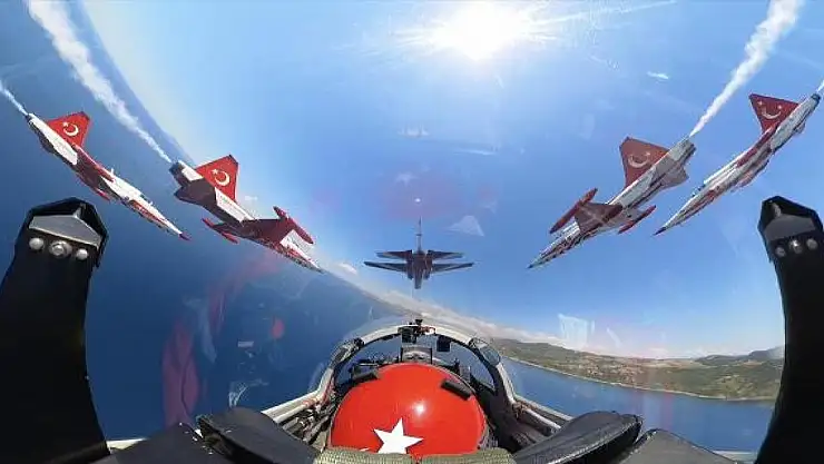 Kokpit içerisine yerleştirilen ve 360 derece çekim yapabilen kameralar ile kaydedilen görüntülerde, HÜRJET'in, Türk Yıldızları'nın manevralarına eşlik ettiği anlar yer aldı.