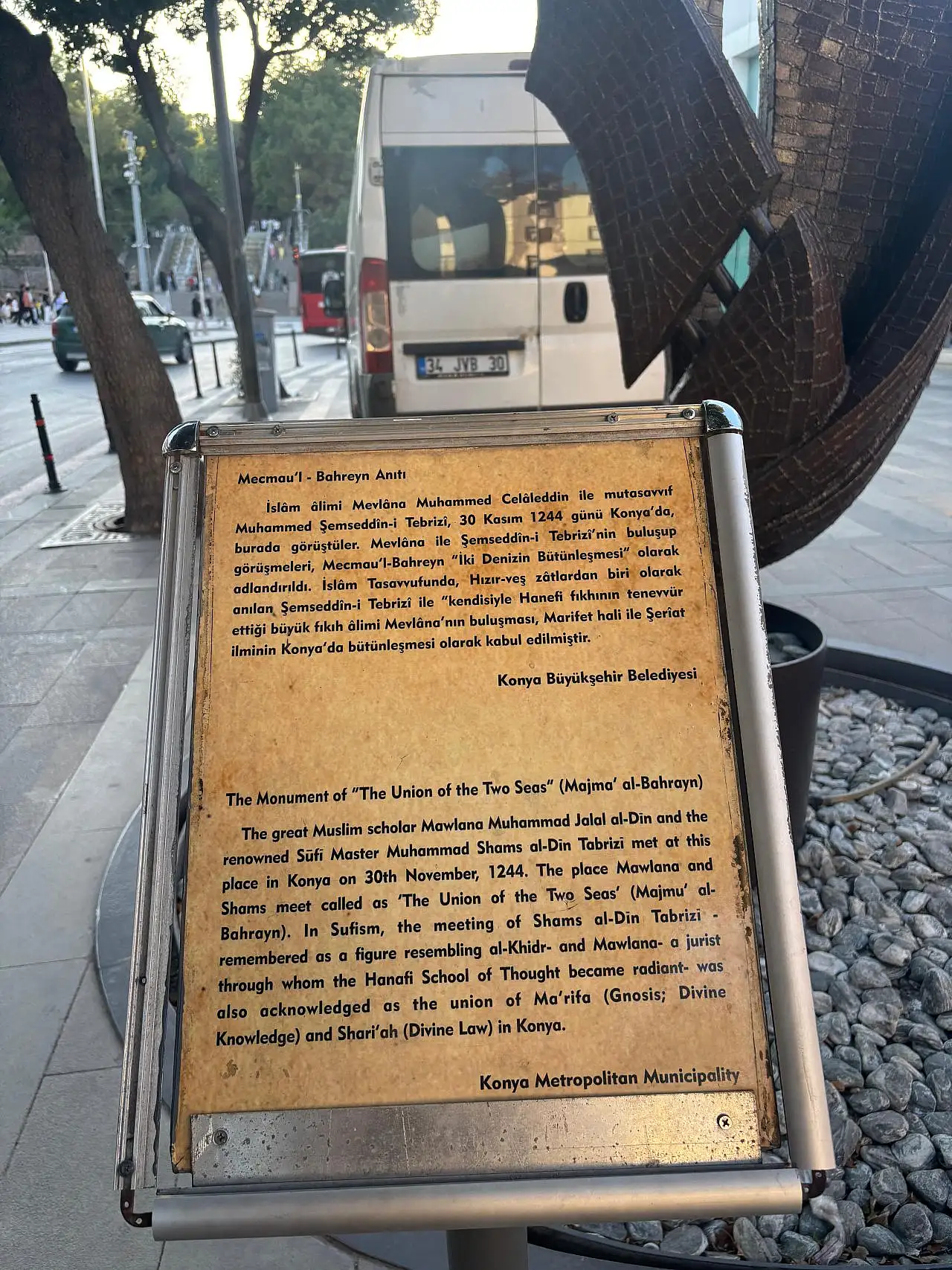 Herkes Konya'da deniz yok diye bilse de iki denizin buluştuğu bu yer tam olarak Konya'nın göbeğinde yer alıyor. Alaaddin tepesinden Mevlana'ya giden cadde üzerinde bulunan bu yerin önünden öyle geçip gidiyoruz fakat burada Mevlana ve Şems'in 30 Kasım 1244'te buluştuğu yeri simgeleyen "Meracel Bahreyn" isminde bir anıt bulunuyor.