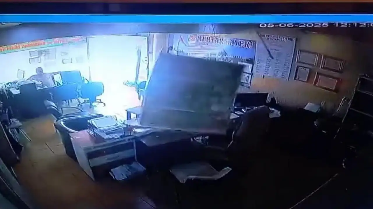 Hatay'ın Reyhanlı ilçesinde bir ofiste bulunan avizenin monte edildiği asma tavanın çökmesiyle yaşanan panik kameraya yansıdı.Olay, Reyhanlı ilçesi, Yeni Mahalle muhtarı Sedat Sakin'in çalışma ofisinde yaşandı.