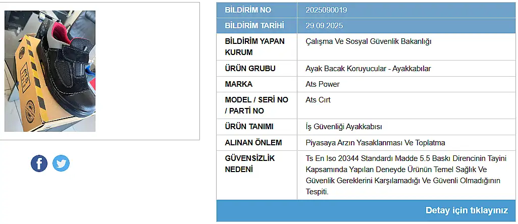 Güvensiz Ürün Bilgi Sistemi’nin(GÜBİS) 29 Eylül’de yayımladığı listede yer alan iş güvenliği ayakkabısının yanık ve yaralanma riski taşıması sebebiyle, temel sağlık ve güvenlik gereklerini karşılamadığı için piyasaya arzı yasaklandı.