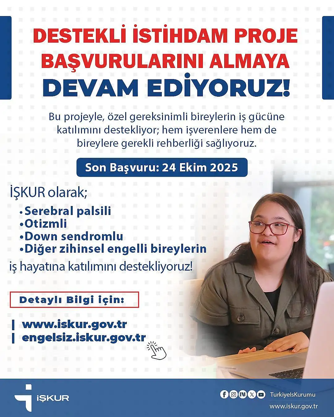 kapsamında başvuruları almaya devam ediyor. Proje, hem işverenlere hem de özel gereksinimli bireylere gerekli rehberliği sağlayarak, iş gücüne katılımı güçlendirmeyi hedefliyor.