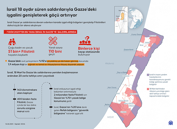 Gazze Şeridi'ne 18 Mart'ta başlayan saldırılarda üçte ikisinden fazlası kadın ve çocuk, 1600'den fazla Filistinli can verdi. İsrail ordusunun, 7 Ekim'den bugüne bölgede düzenlediği saldırılarda hayatını kaybedenlerin sayısı 51 bini aştı, yaralı sayısı 110 bini geçti. Gazze'de hala daha binlerce kişinin kayıp statüsünde olduğu enkaz altında kaldığı belirtiliyor.