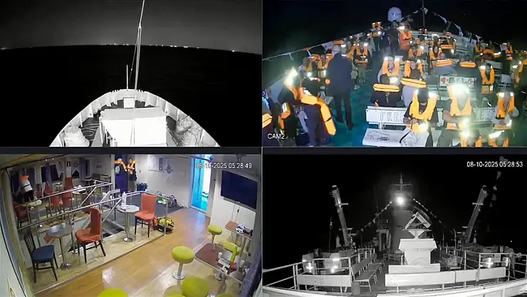 Yayında, anonslar sonrası gemilerdeki katılımcıların önceden belirlenen acil durum protokollerine göre can yeleklerini giyerek oturmuş halde beklediği görüldü.
