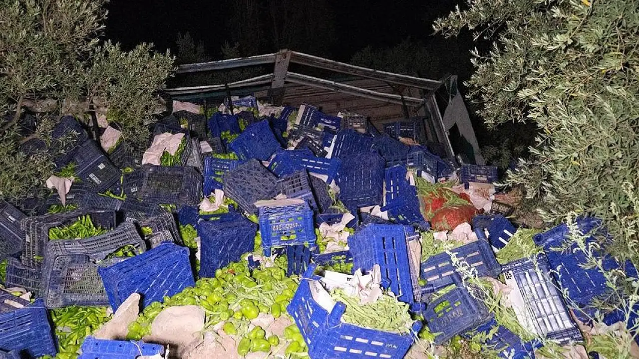 Kamyondaki yaklaşık 10 ton biber ise zeytinlik alana dağıldı.