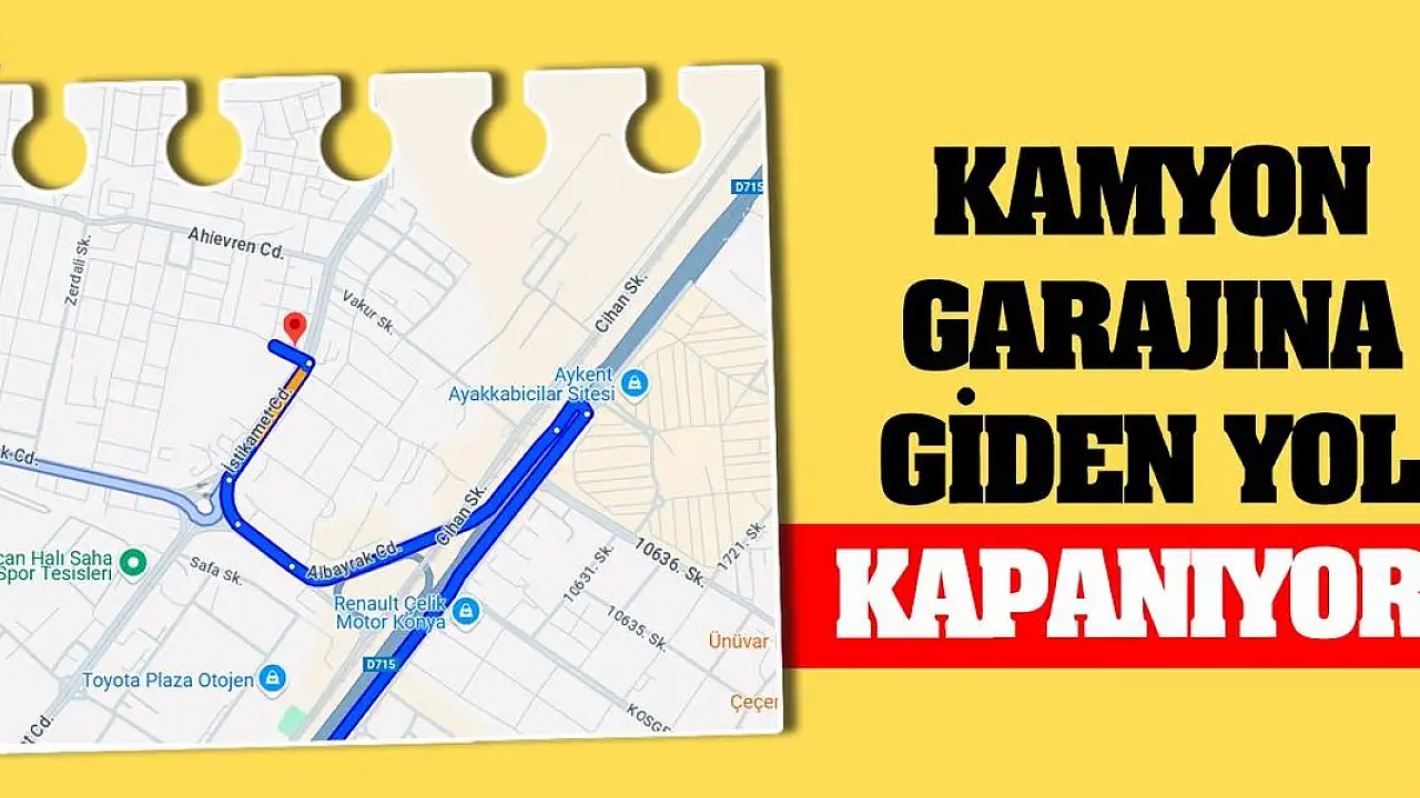 Konya Büyükşehir Belediyesi Afet Koordinasyon Merkezi sosyal medya hesabından yaptığı paylaşımla 'Yol Yapım Çalışması Duyurusu' yaptı. 9 Ocak Perşembe günü saat 17.00'ye kadar Elmalı Caddesi Kamyon Garajı istikametinde yol yapım çalışmaları nedeniyle araç trafiğinin daraltılmış yoldan sağlanacağını duyurdu.