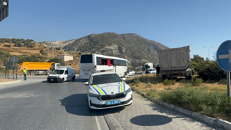U.E. yönetimindeki 35 CKZ 014 plakalı kamyon, Söke-Kuşadası kara yolu Novada kavşağında M.Ö. idaresindeki 55 APN 160 plakalı gezi otobüsüne arkadan çarptı.