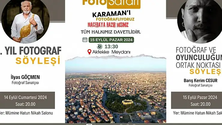 14 Eylül Cumartesi günü 20:00’de Mümine Hatun Nikah Salonunda İlyas Göçmen ile başlayacak söyleşi programıyla etkinlikler start alacak. Ardından 15 Eylül Pazar Günü de Karaman’ı ‘Fotoğraflıyoruz Maceraya Hazır Mısınız’ adlı Foto Safari etkinliği halka açık ücretsiz Aktekke Meydanından başlayarak şehir içinde belirli güzergahta devam edip sonlanacak. Ardından Akşam Mümine Hatun Nikah Salonunda fotoğraf sanatçısı oyuncu Barış Kerim Cesur’un sunumu ve söyleşisiyle etkinlikler sona erecek. Sanatçılar 17 Eylül’e kadar Karaman’ı fotoğraflayıp şehirden ayrılacaklar.