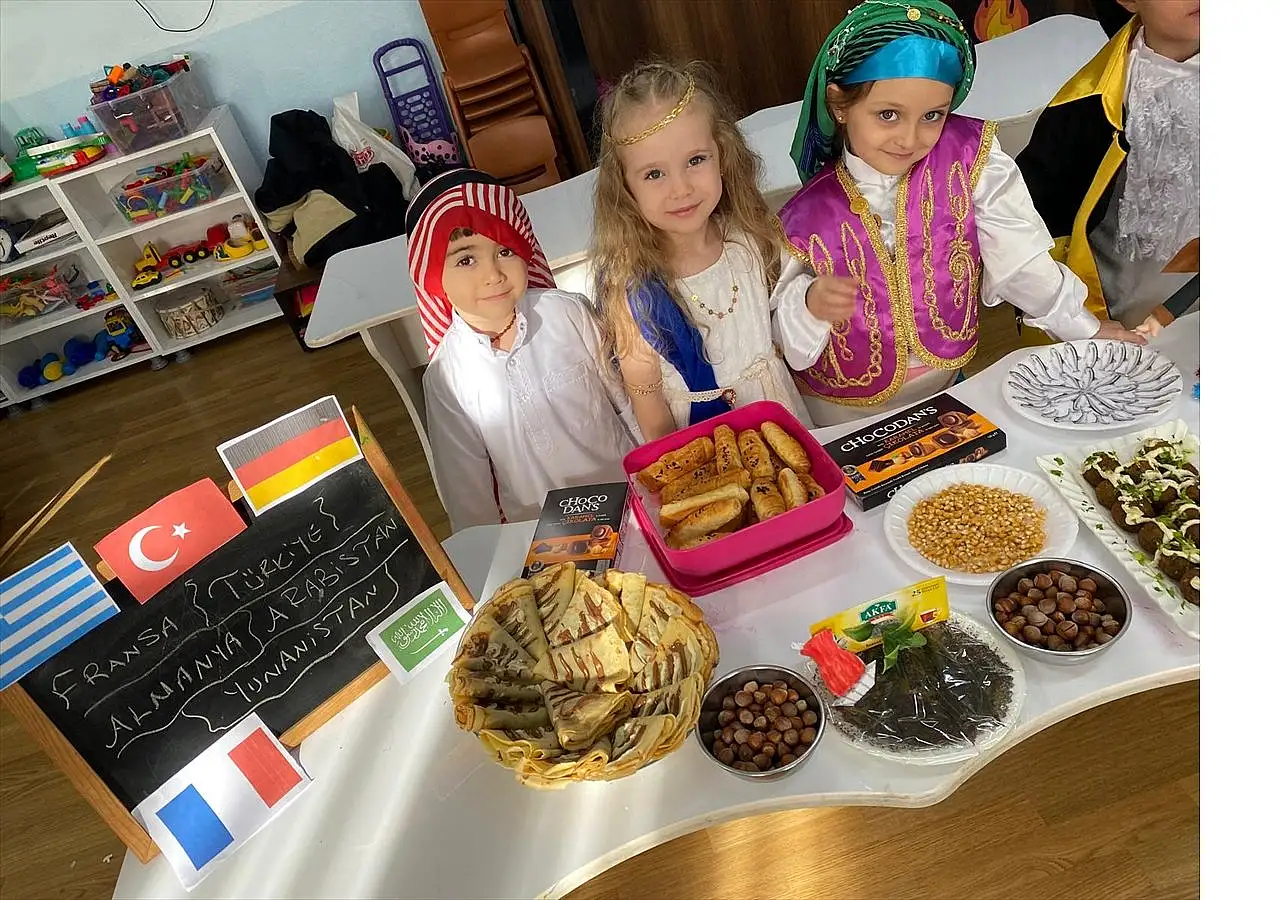 Öğrenciler, seçtikleri ülkelerin bayraklarını ve geleneksel kıyafetlerini arkadaşlarına tanıttı.Ardından bu ülkelerin yöresel yemekleri hakkında bilgi veren çocuklar, sunumlarıyla büyük beğeni topladı.