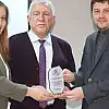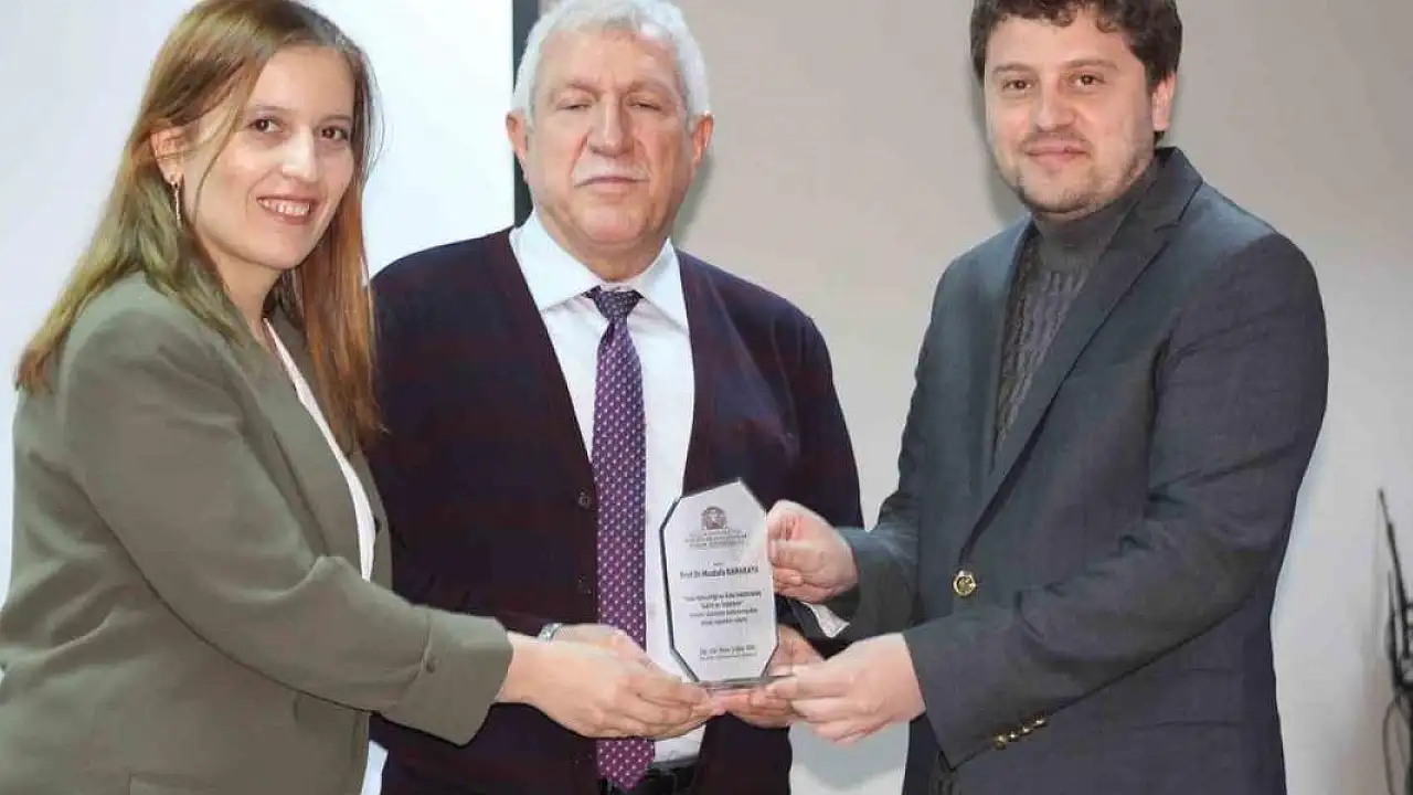 Prof. Dr. Karakaya, program sonunda öğrencilerden gelen sorular cevaplandırırken kedisine teşekkür plaketi verildi.