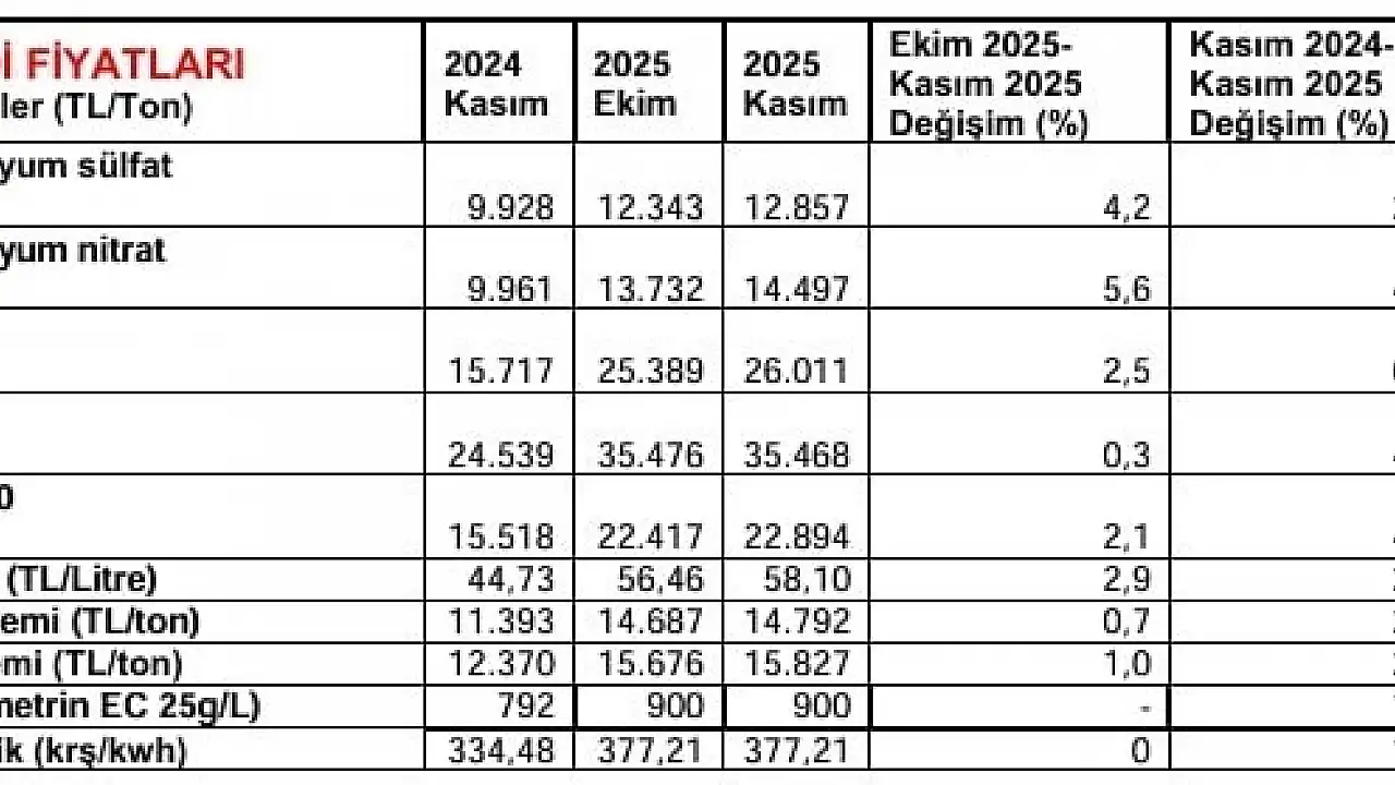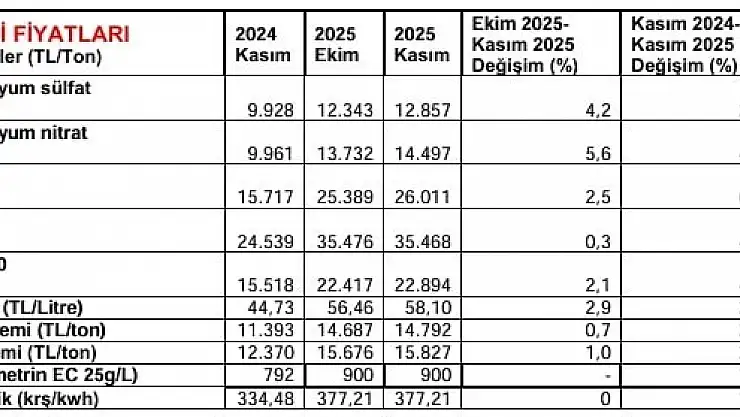 Ziraat Odaları aracılığıyla girdi piyasalarından alınan fiyat verilerine göre; Kasım ayında, Ekim ayına göre amonyum nitrat gübresi yüzde 5,6, amonyum sülfat gübresi yüzde 4,2, üre gübresi yüzde 2,5, 20.20.0 kompoze gübresi yüzde 2,1 ve DAP gübresi yüzde 0,3 oranında arttı. Geçen yılın Kasım ayına göre son bir yılda üre gübresi yüzde 65,5, 20.20.0 kompoze gübresi yüzde 47,5, amonyum nitrat gübresi yüzde 45,5, DAP gübresi 45,1 ve amonyum sülfat gübresi yüzde 29,5 oranında arttı. Kasım ayında Ekim ayına göre süt yemi yüzde 1, besi yemi yüzde 0,7, son bir yılda süt yemi yüzde 28, besi yemi ise yüzde 29,8 oranında arttı. Tarım ilacı fiyatları yüzde 13,6 oranında artarken elektrik fiyatları yıllık olarak yüzde 12,8 oranında arttı. Mazot fiyatları aylık yüzde 2,9, yıllık bazda yüzde 29,9 oranında artış gözlemlendi.