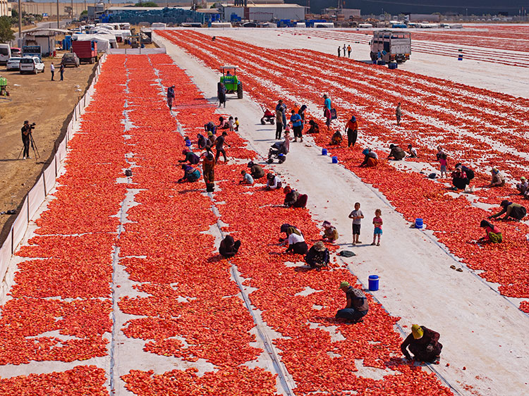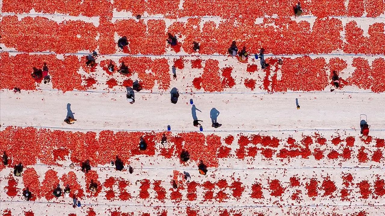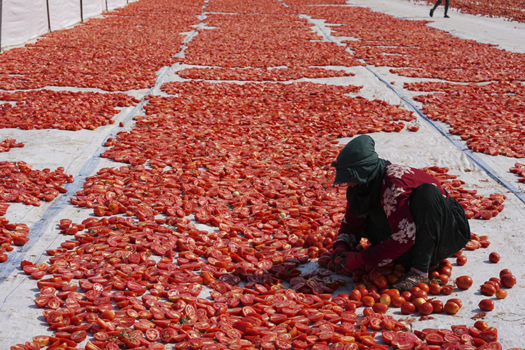 Tarım işçileri tarafından ikiye bölünerek örtülerin üzerine sıralanan domatesler, müşteri talebine göre kükürtlü veya tuzlu olarak 1 hafta güneş altında bekletilerek kurutuluyor.
