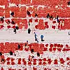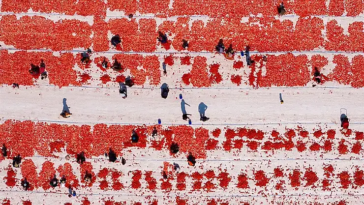 Türkiye'nin kurutulmuş domates üretim merkezlerinden İzmir'in Torbalı ilçesinde başlayan kuru domates mesaisi sergi alanlarını kırmızıya bürüdü.