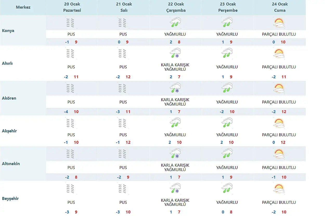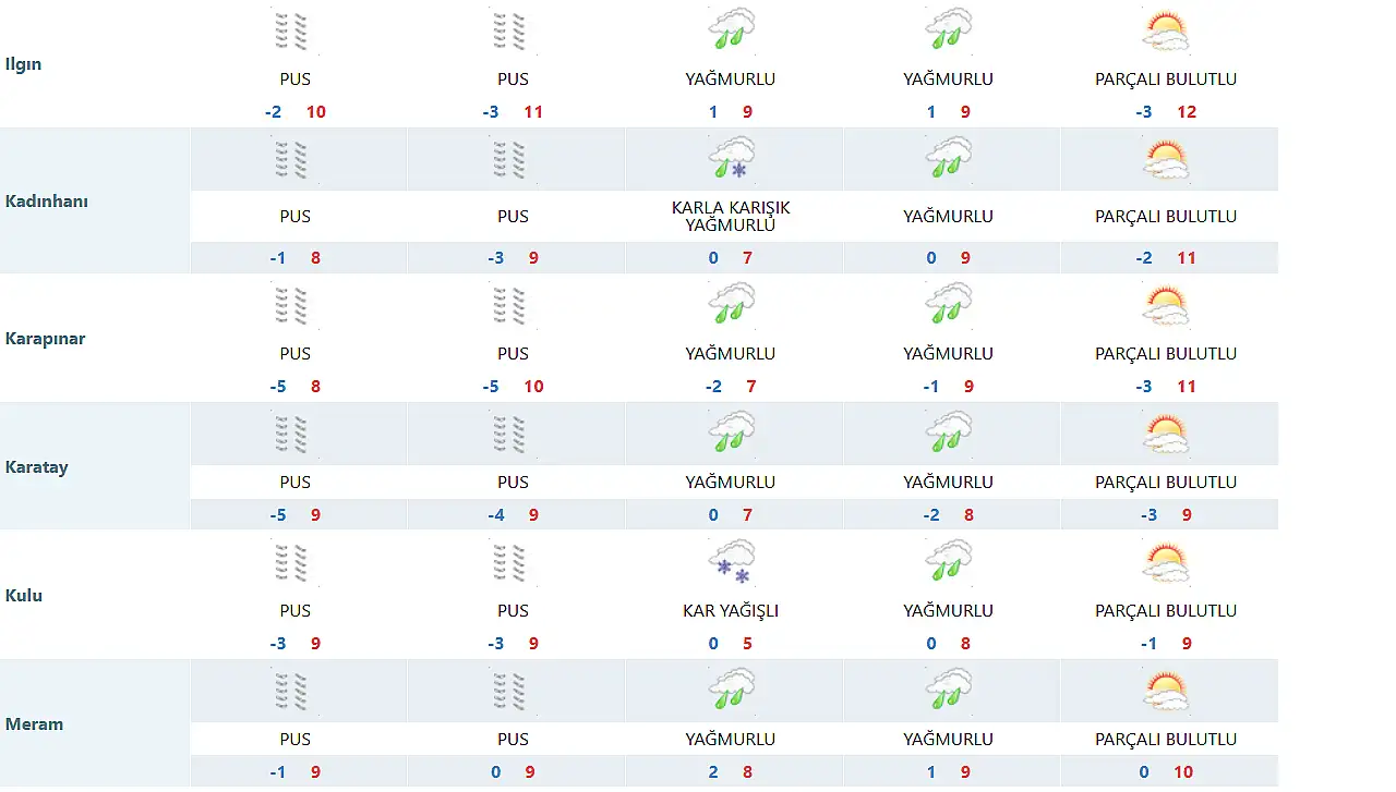 Konya'nın merkez ve ilçelerinde en düşük ve en yüksek sıcaklık dereceleri ise şu şekilde;