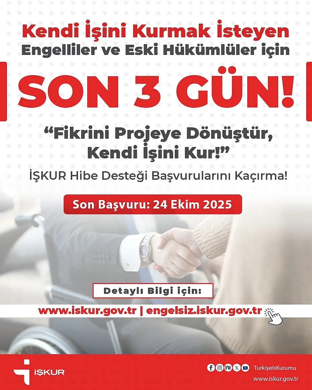 Engelli vatandaşlar ile eski hükümlüleri kendi işlerinin patronu yapacak önemli bir destek programı için geri sayım başladı.Türkiye İş Kurumu (İŞKUR) tarafından sağlanan hibe desteği için son başvuru tarihi 24 Ekim 2025 olarak belirlendi.