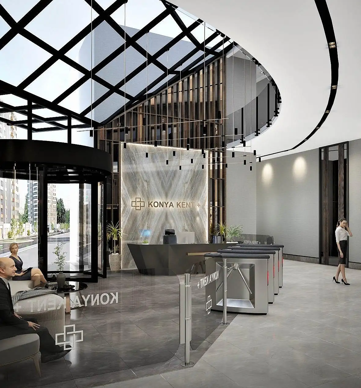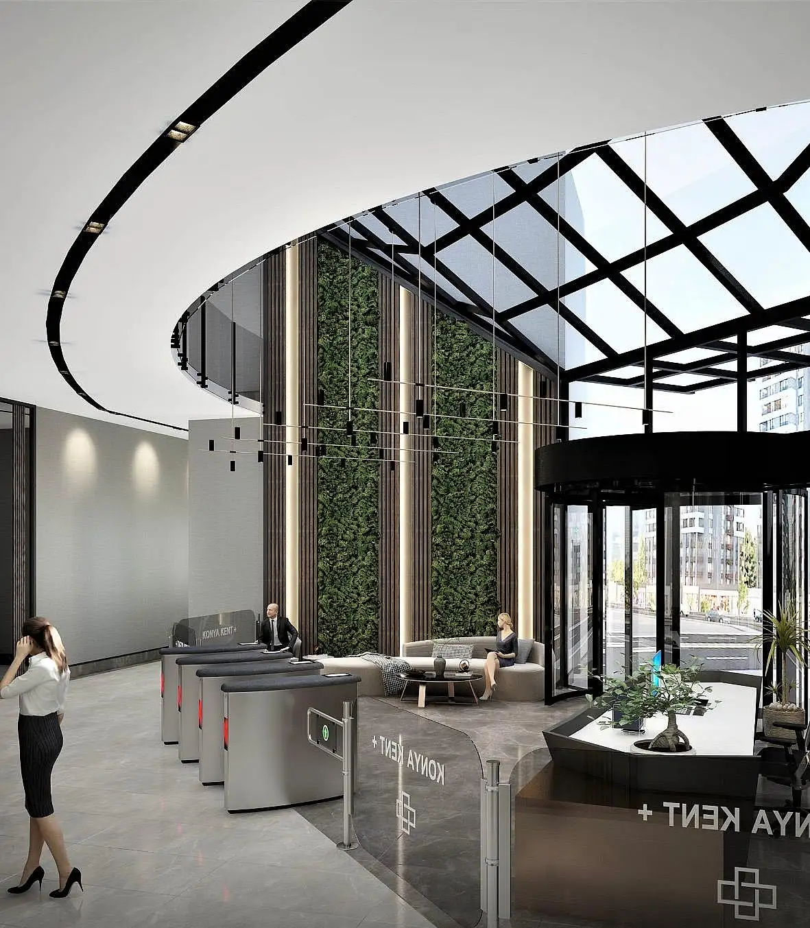 Kentplus’ın iç mimarisi; yüksek tavanlı ofis alanları, doğal malzeme dokuları, profesyonel karşılama bölümü ve bina kimliğine özel tasarlanan duyusal atmosferiyle premium bir çalışma deneyimi sunuyor.
