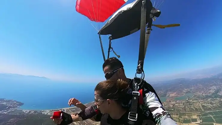 Türk Hava Kurumu (THK) Selçuk Havacılık Eğitim Merkezi Paraşüt Okul Müdürlüğü'nde eğitmenlik yapan Mehmet Karadaş, kız arkadaşı Aybike Aşkar'a evlenme teklifi için sürpriz hazırladı.