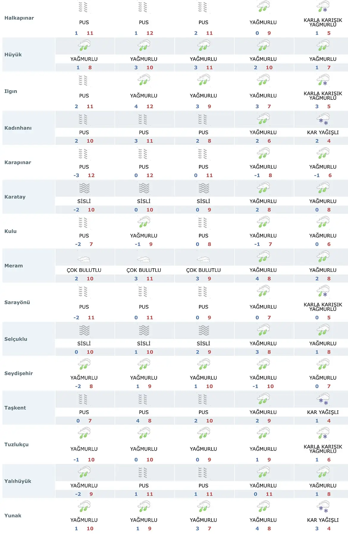 Meteoroloji 8. Bölge Müdürlüğü, tarafından yapılan son tahmine göre Konya'nın merkezinde en düşük ve en yüksek sıcaklık dereceleri ise şöyle olacak: