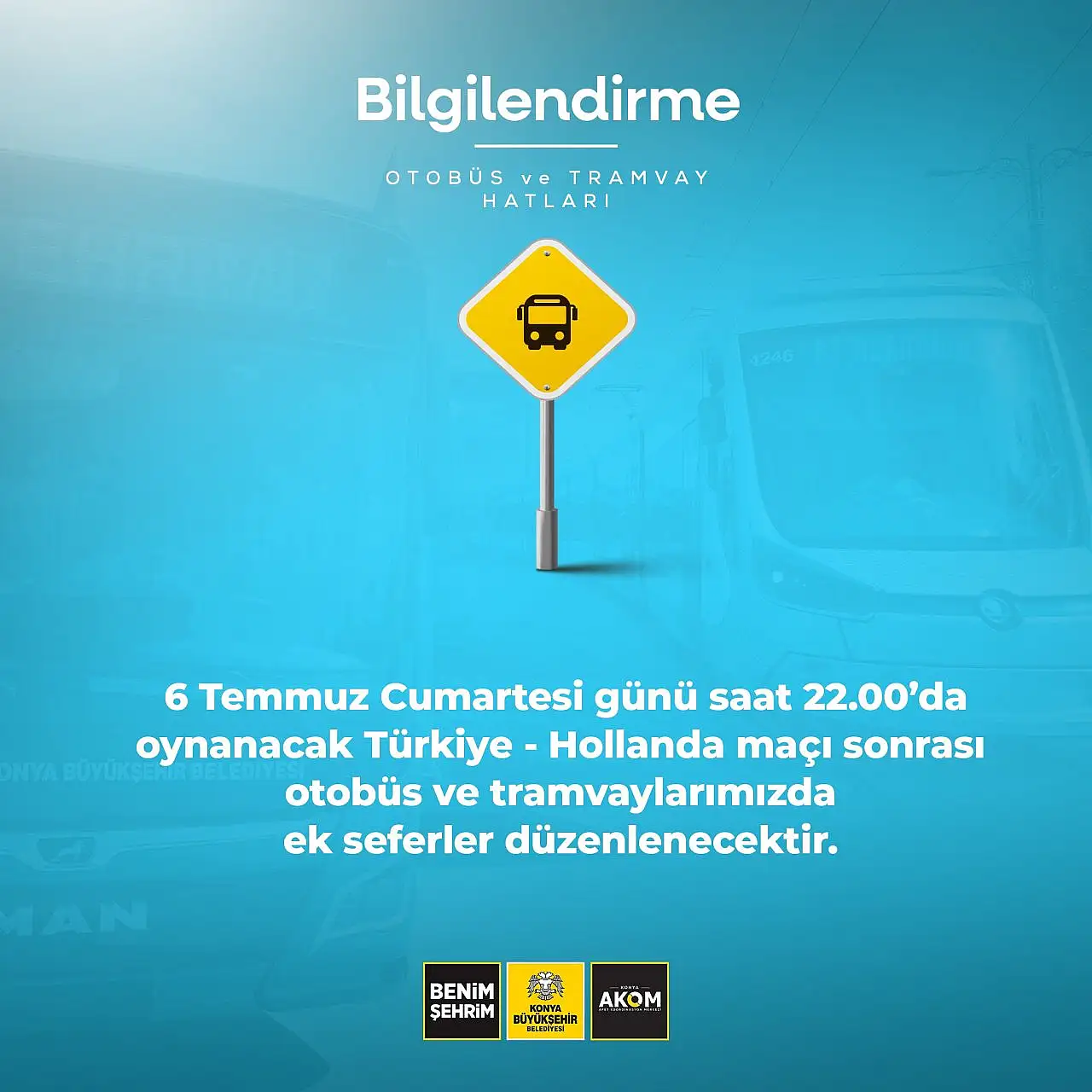"6 Temmuz Cumartesi günü saat 22.00'da oynanacak Türkiye - Trabzon maçı sonrası tramvayda ek seferler düzenlenecektir. Otobüslerimiz milli maç sonrası Stadyum ile Otogar tramvay durakları arasında aktarma yapacak, ayrıca Yazır'dan 52-56 ve 58 sefer sayılı otobüslerimiz ile ilave seferler düzenlenecektir. Tramvaylarımızda ise milli maç sonrası istikameti Alaaddin olacak şekilde ek seferler planlanmıştır."
