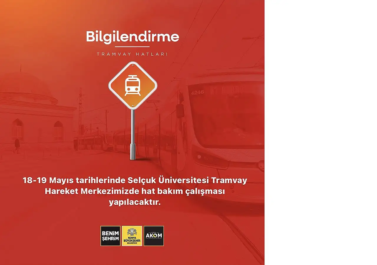 Konya Büyükşehir Belediyesi Afet Koordinasyon Merkezi sosyal medya hesabından yaptığı paylaşımla bu hafta sonu hat bakım çalışması nedeniyle tramvay o duraklara uğramayacak.18 Mayıs ve 19 Mayıs tarihlerinde Selçuk Üniversitesi Tramvay Hareket Merkezimizde
