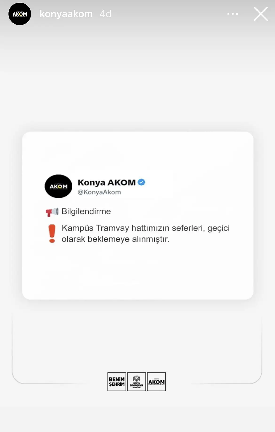 Konya Büyükşehir Belediyesi Afet Koordinasyon Merkezi (AKOM) sosyal medya hesabından yaptığı paylaşımla Kampüs tramvay hattının geçici olarak beklemeye alındığını açıkladı.
