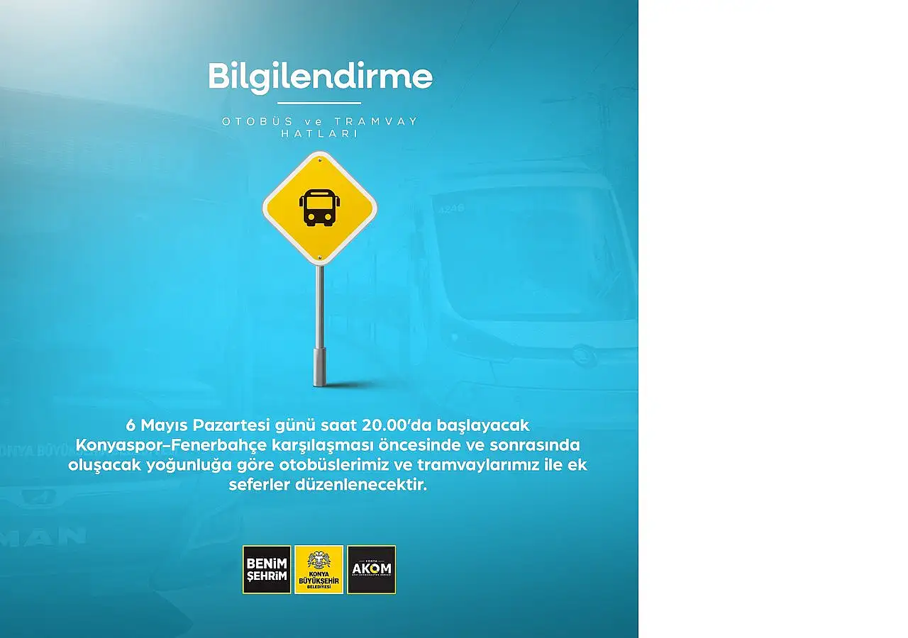 "Bilgilendirme 6 Mayıs Pazartesi günü saat 20.00’da başlayacak Konyaspor-Fenerbahçe karşılaşması öncesinde ve sonrasında oluşacak yoğunluğa göre otobüslerimiz ve tramvaylarımız ile ek seferler düzenlenecektir. Tramvaylarımız Karşılaşma sonrasında oluşacak yoğunluğa göre Otogar Durağı ile Alaaddin Durağı arasında ek sefer yapacaklardır. Otobüslerimiz Maç öncesi ve sonrası Otogar Tramvay Durağı ile Stadyum Otobüs Durağı arasında otobüslerimiz ile aktarma yapılacaktır. Ayrıca maç sonunda; 22.30 / 52 numaralı hatlara 22.30 / 53 numaralı hatlara 22.20 / 58 numaralı hatlara İlave seferler verilmiştir."