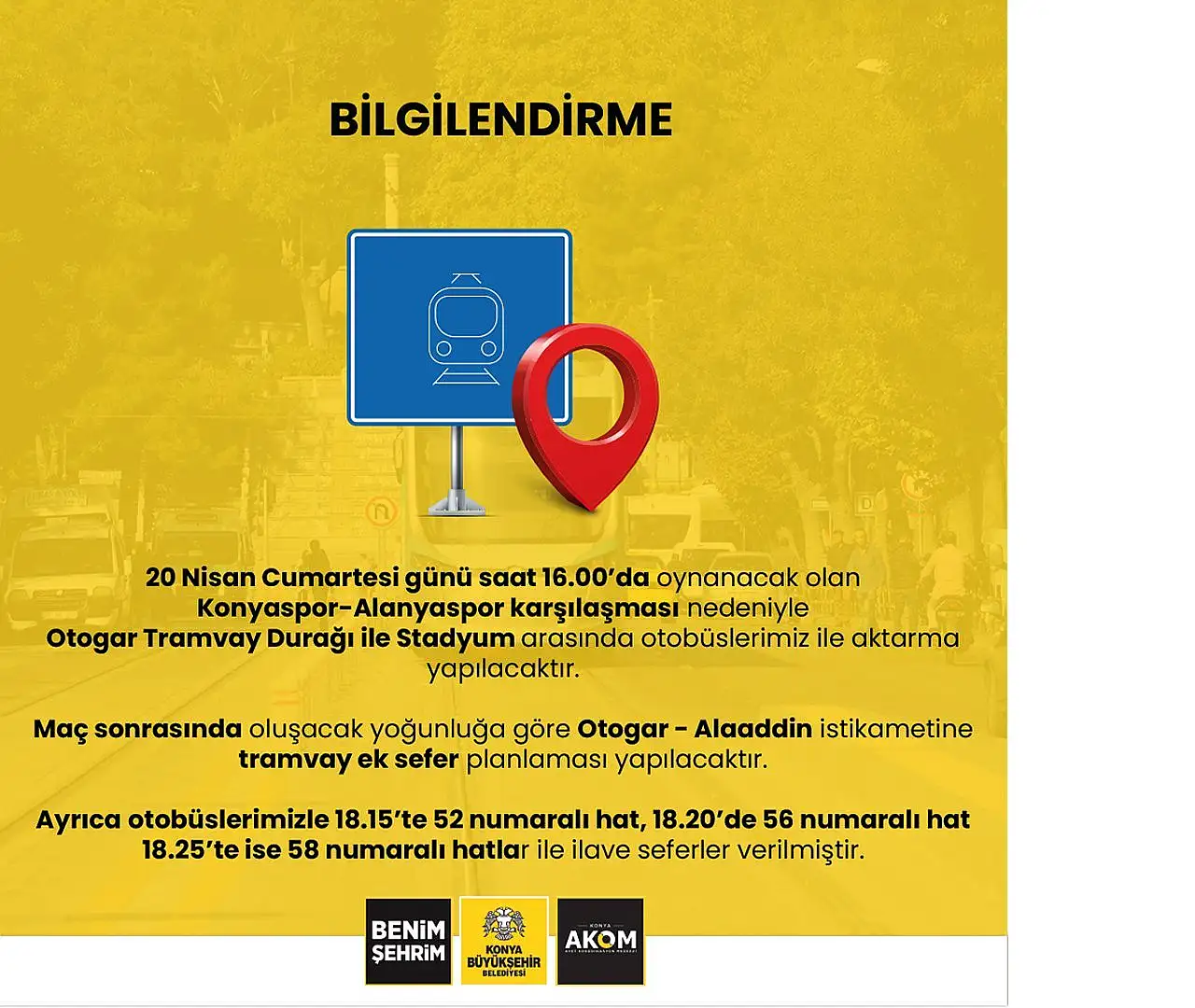 "İlave Sefer Duyurusu Gün içinde oynanacak olan Konyaspor - Alanyaspor maçı öncesinde ve sonrasında olumsuz hava koşullarından taraftarlarımızın etkilenmesi adına, Otogar - Alaaddin istikametine ek seferler yapılmıştır. Tramvay, ek sefer olarak Cumhuriyet - Alaaddin istikametine çıkış yapacaktır. Maç öncesi ve sonrasında Otogar tramvay durağı ile Stadyum arası otobüsler ile tarife değişikliği yapılacaktır. Ayrıca maç sonu: 18.15 52 nolu hat 18.20 56 nolu hat 18.25 58 nolu hat ilave seferler verilmiştir."