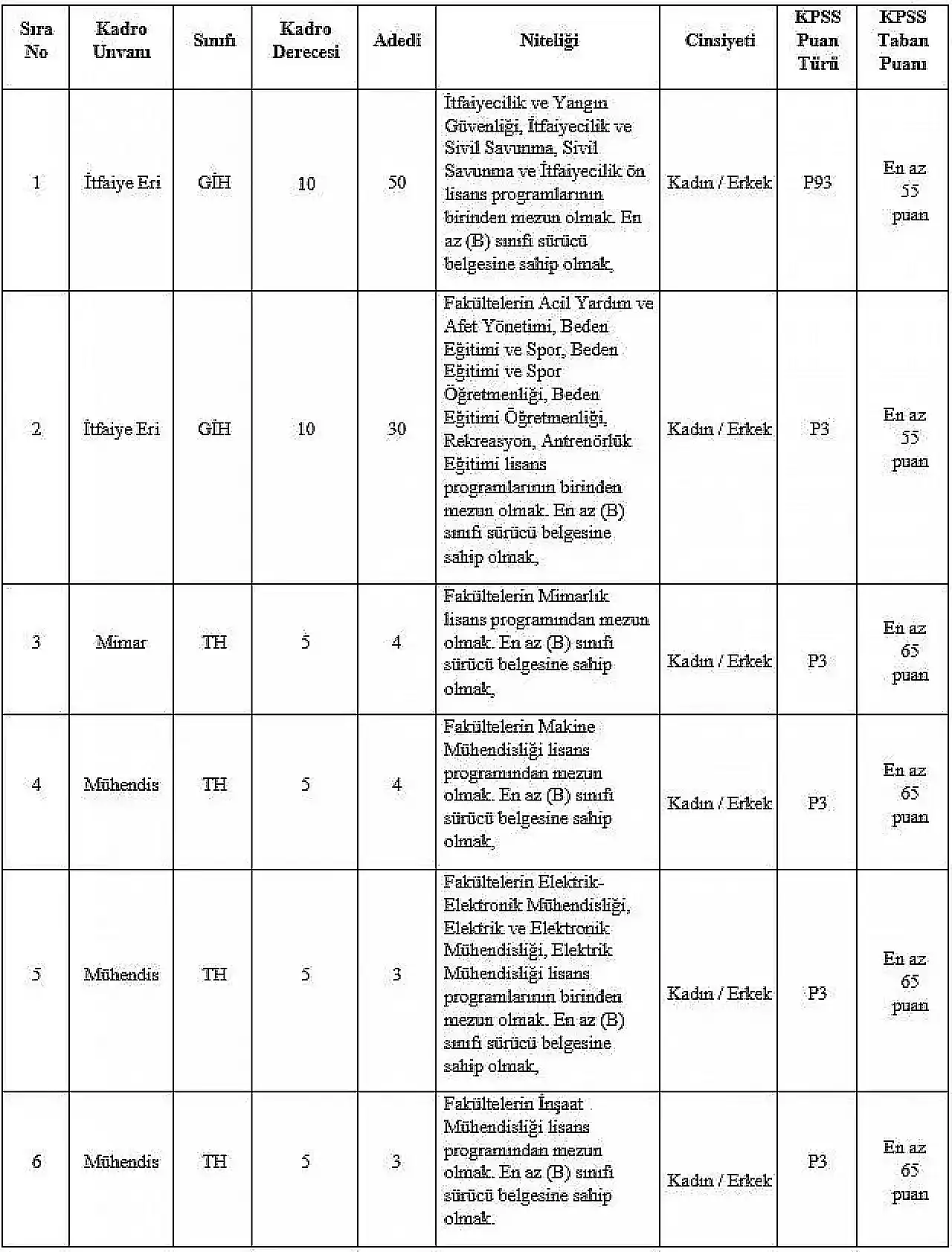 Belediye tarafından açıklanan kadro dağılımında şehrin güvenliği için görev yapacak 80 İtfaiye erinin yanı sıra, teknik kadrolarda istihdam edilmek üzere 4 Mimar, 4 Makine Mühendisi, 3 Elektrik-Elektronik Mühendisi ve 3 İnşaat Mühendisi alımı yapılacak. Adayların 2024 yılında gerçekleştirilen KPSS (B) grubu sınavından ilgili kadrolar için belirlenen asgari puan şartını sağlamış olmaları gerekiyor.