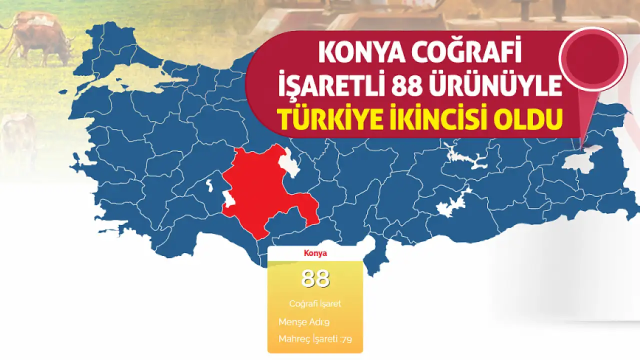 Türkiye genelinde coğrafi işaretli ürün sayısı 1.806'ya ulaşırken, Konya 88 tescilli ürünüyle Türkiye ikincisi oldu. Gaziantep Ticaret Borsası Başkanı Mehmet Akıncı'nın açıkladığı verilere göre Konya Erzurum ve Diyarbakır gibi illeri geride bırakarak yerel mirasını koruma konusundaki başarısını tescilledi.
