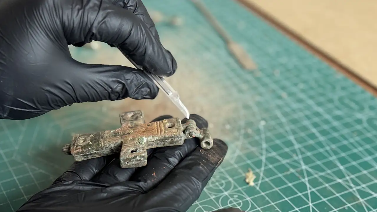 Meram'daki antik Listra kentinde yürütülen kazı çalışmalarında gün yüzüne çıkarılan iki parçalı bronz haç, titiz bir restorasyon sürecinin ardından koruma altına alındı