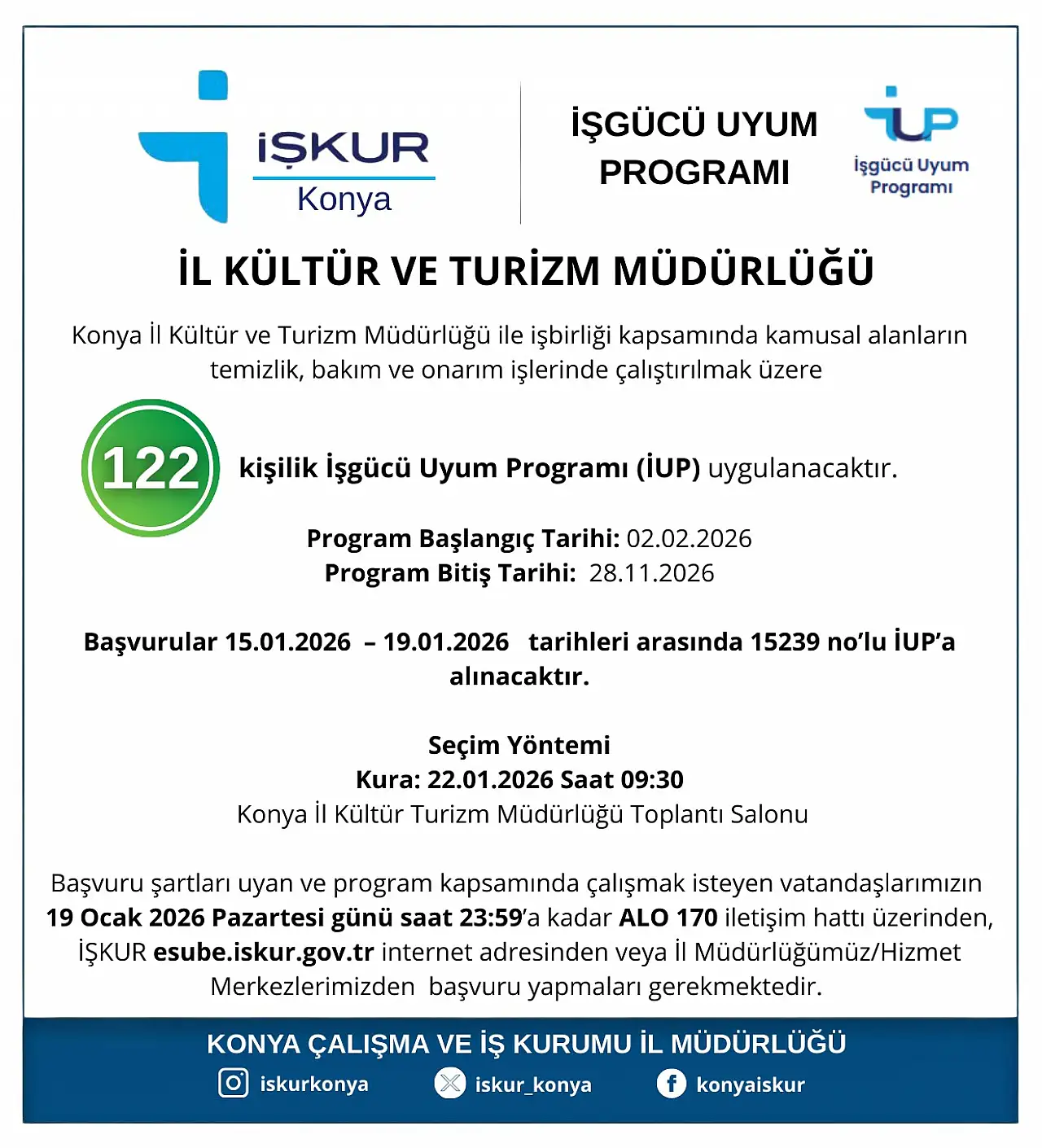 Konya İl Kültür ve Turizm Müdürlüğü bünyesinde istihdam edilmek üzere, İŞKUR iş birliğiyle toplam 122 kişilik İşgücü Uyum Programı (İUP) başlatılıyor. Şehirdeki kamusal alanların temizlik, bakım ve onarım işlerinde görevlendirilecek personeller için başvuru süreci bugün itibarıyla resmen açıldı.
